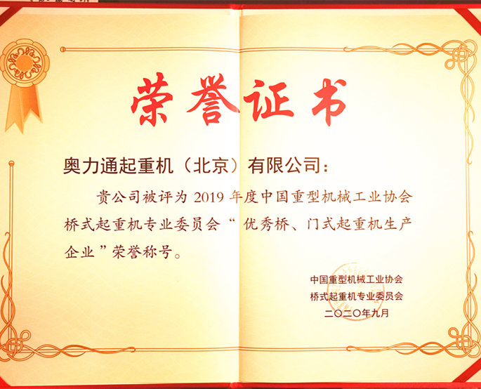 十月是个美好的月份,也是秋高气爽的好日子,金桂飘香,硕果累累,是有耕耘、有收获的季节。协会为表扬先进、树立典型、引领和推动行业向更高层次发展,对年度“优秀桥、门式起重机生产企业”进行了隆重表彰。米兰(中国)官网起重机(北京)有限公司有幸荣获2019年度“优秀桥、门式起重机生产企业”荣誉称号。