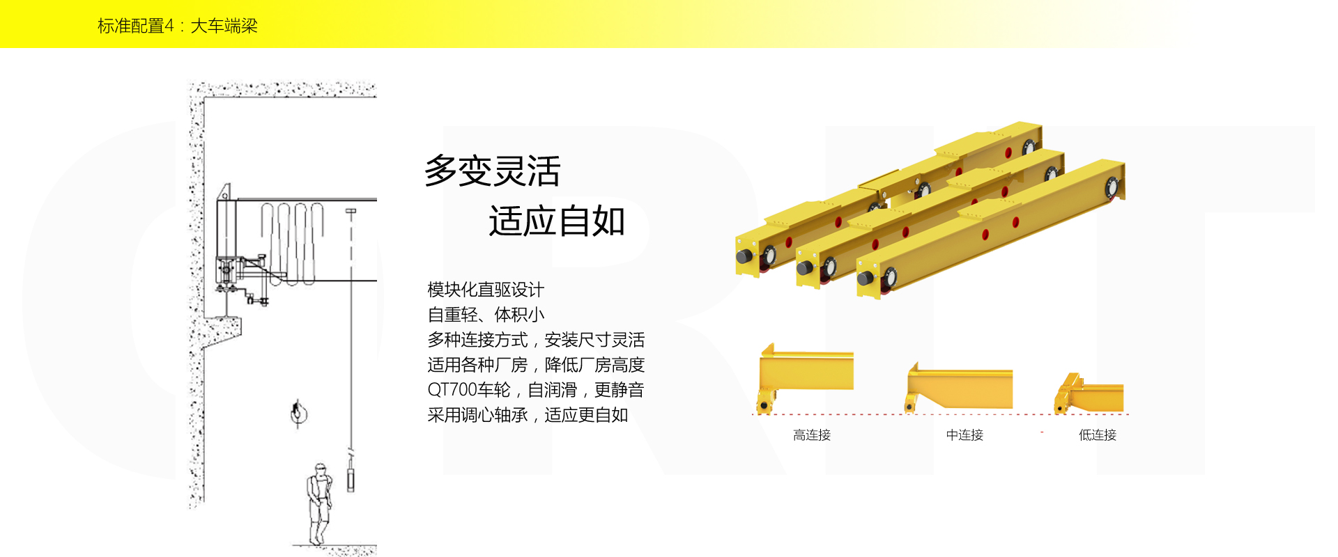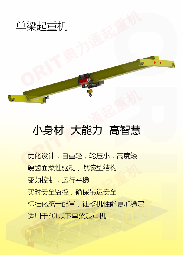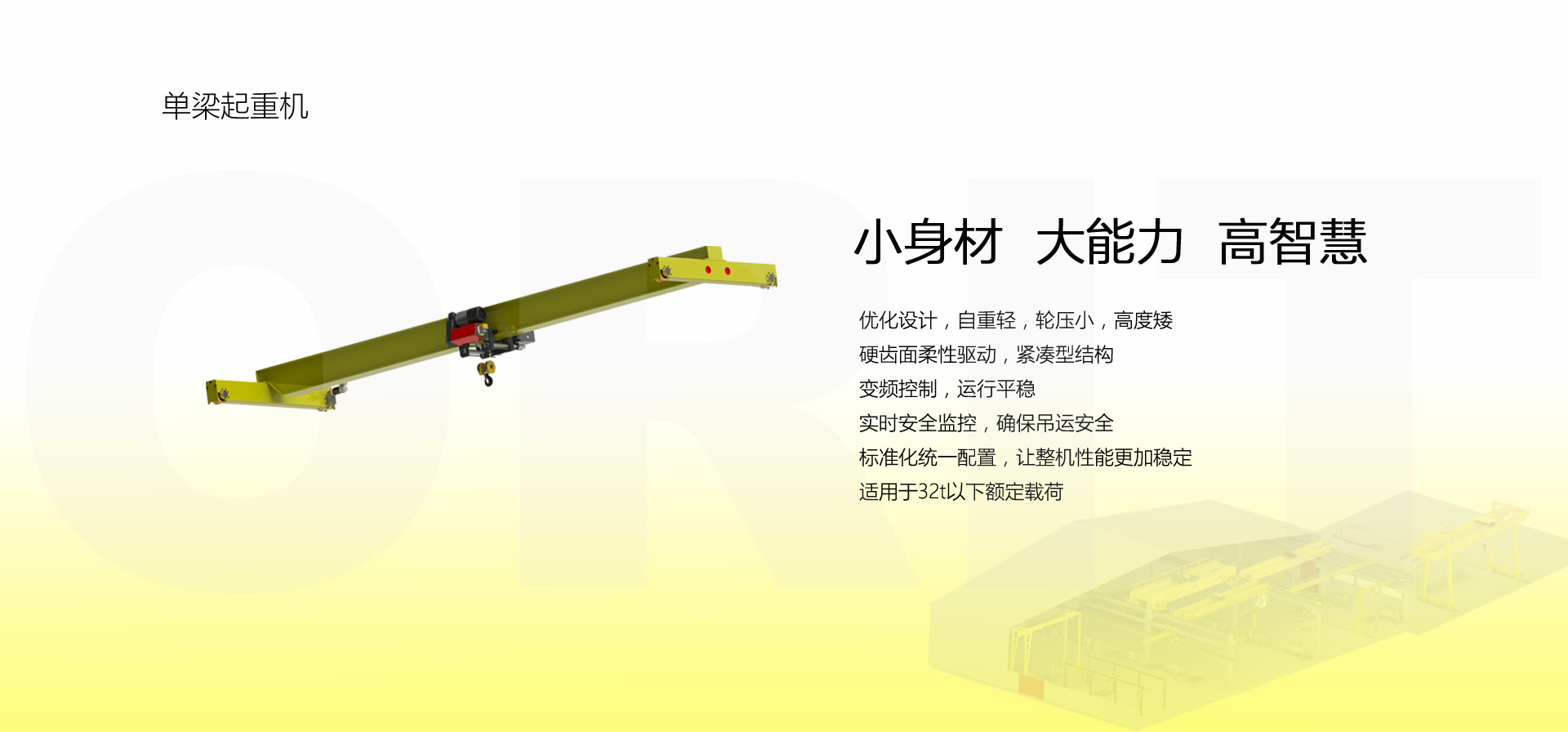 产品名称:单梁桥式起重机 小身材、大能力、高智慧 优化设计,自重轻,轮压小,高度矮 硬齿面柔性驱动,紧凑型结构 变频控制,运行平稳 实时安全监控,确保吊运安全 标准化配置,让性能无比稳定 适用于32t以下额定载荷 标准配置1:起升机构 颠覆传统,自成一体 低净空设计 柔性驱动,内应力小,传动效率高 重级制电机,接电持续率60%ED 行走变频无极调速,运行平稳 自调试电磁盘式制动器,可靠,防尘 2160N/mm² 高强度镀锌钢丝绳,免维护 全周型导绳器,防松绳 全系标配安全监控系统 标准配置2:三合一驱动 静音科技,静享搬运 结构紧凑,铝合金壳体,密封 变频电机+硬齿面减速箱+盘式制动器 三合一集成化设计 全变频调速 最高转速4800 r/min 防护等级IP55 半油脂润滑,免维护 静音科技,静享搬运 标准配置3:电控系统 安全随心掌控 智能安全监控器 计算起升机构剩余安全工作时间 累计起升工作时间 累计超载次数 累计起升电机启动次数 起升电机过热保护及报警 刹车片厚度报警 ... ... 远程通讯 施耐德电气元件 航空插座接口 IP55防护等级 标准配置4:端梁 多变灵活,适应自如 模块化直驱设计 自重轻、体积小 多种连接方式,安装尺寸灵活 适用各种厂房,降低厂房高度 QT700车轮,自润滑,更静音 采用调心轴承,适应更自如 应用