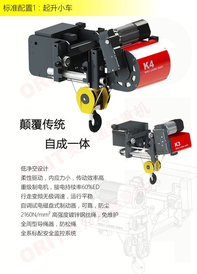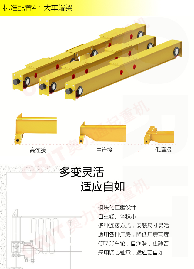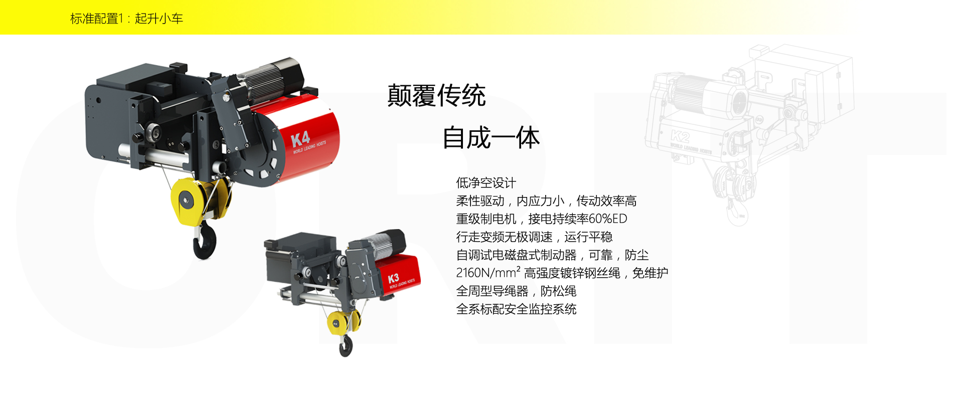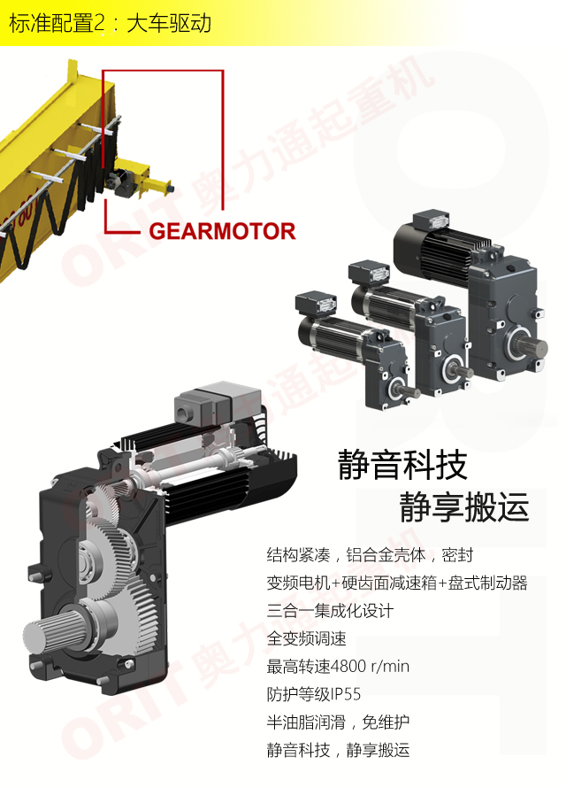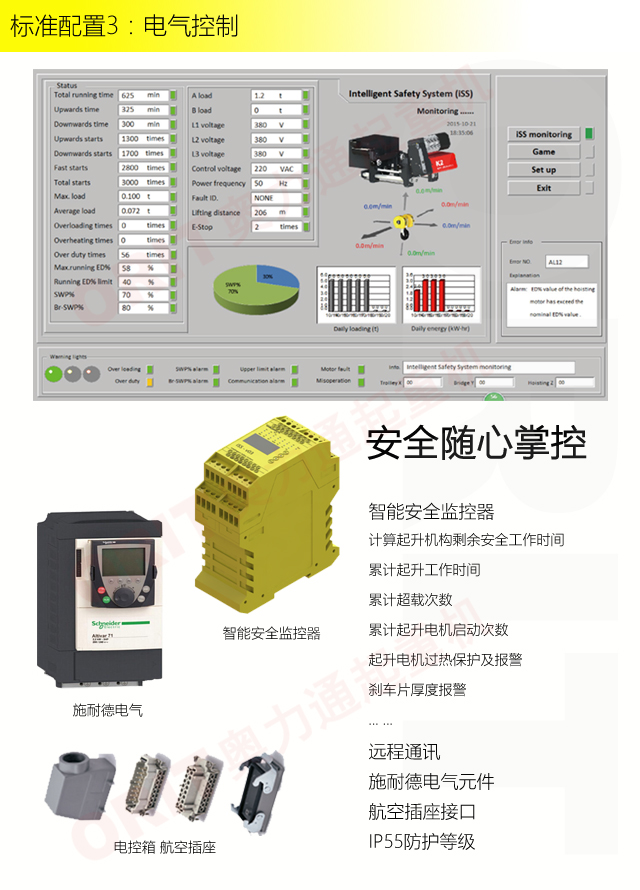产品名称:单梁桥式起重机 小身材、大能力、高智慧 优化设计,自重轻,轮压小,高度矮 硬齿面柔性驱动,紧凑型结构 变频控制,运行平稳 实时安全监控,确保吊运安全 标准化配置,让性能无比稳定 适用于32t以下额定载荷 标准配置1:起升机构 颠覆传统,自成一体 低净空设计 柔性驱动,内应力小,传动效率高 重级制电机,接电持续率60%ED 行走变频无极调速,运行平稳 自调试电磁盘式制动器,可靠,防尘 2160N/mm² 高强度镀锌钢丝绳,免维护 全周型导绳器,防松绳 全系标配安全监控系统 标准配置2:三合一驱动 静音科技,静享搬运 结构紧凑,铝合金壳体,密封 变频电机+硬齿面减速箱+盘式制动器 三合一集成化设计 全变频调速 最高转速4800 r/min 防护等级IP55 半油脂润滑,免维护 静音科技,静享搬运 标准配置3:电控系统 安全随心掌控 智能安全监控器 计算起升机构剩余安全工作时间 累计起升工作时间 累计超载次数 累计起升电机启动次数 起升电机过热保护及报警 刹车片厚度报警 ... ... 远程通讯 施耐德电气元件 航空插座接口 IP55防护等级 标准配置4:端梁 多变灵活,适应自如 模块化直驱设计 自重轻、体积小 多种连接方式,安装尺寸灵活 适用各种厂房,降低厂房高度 QT700车轮,自润滑,更静音 采用调心轴承,适应更自如 应用