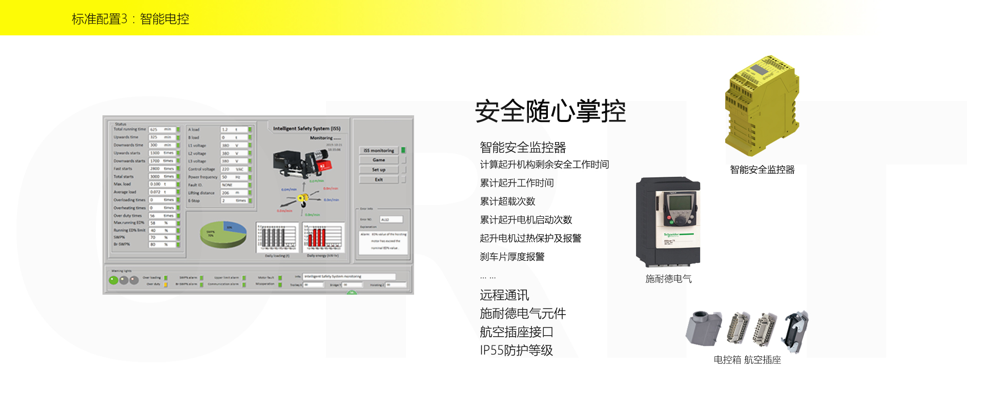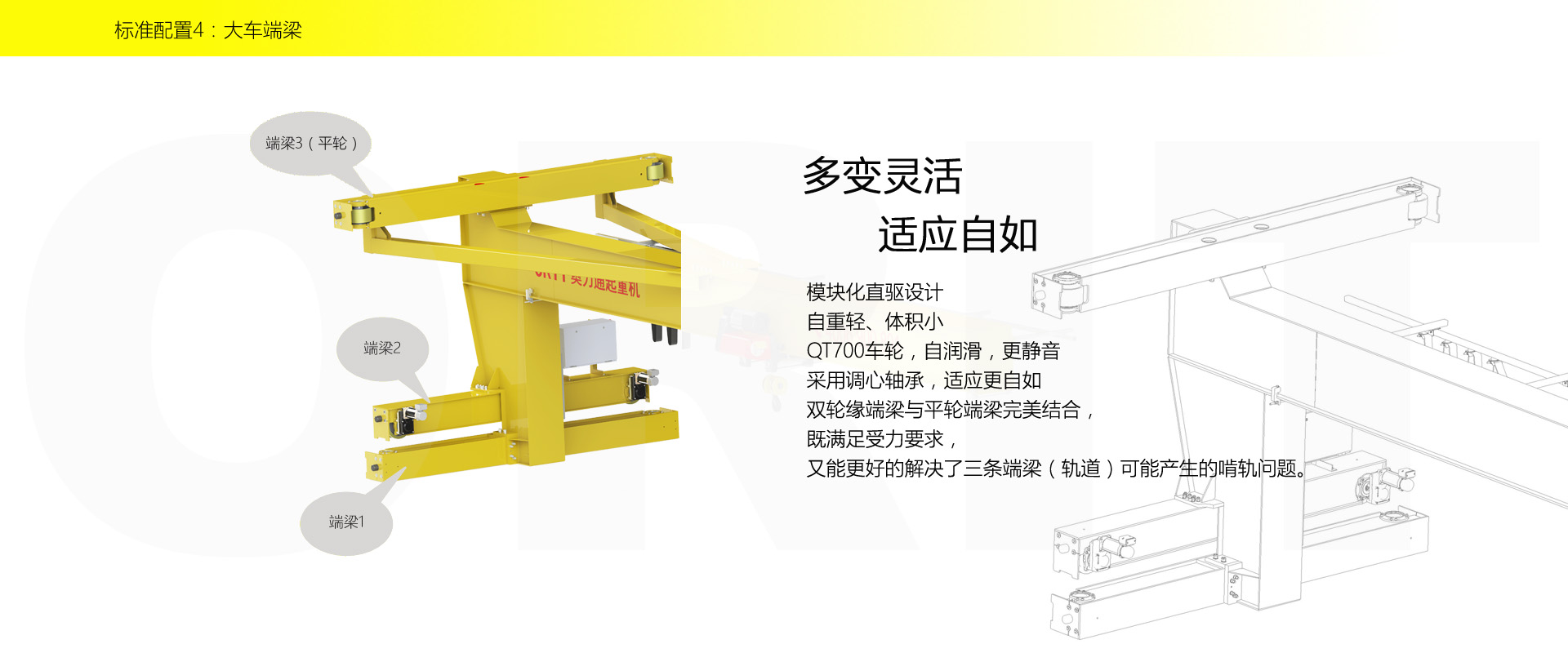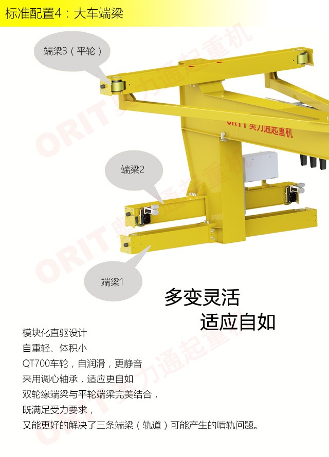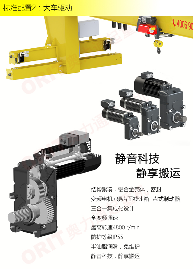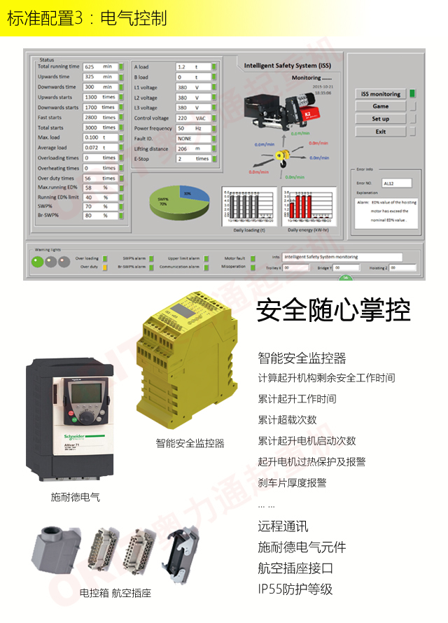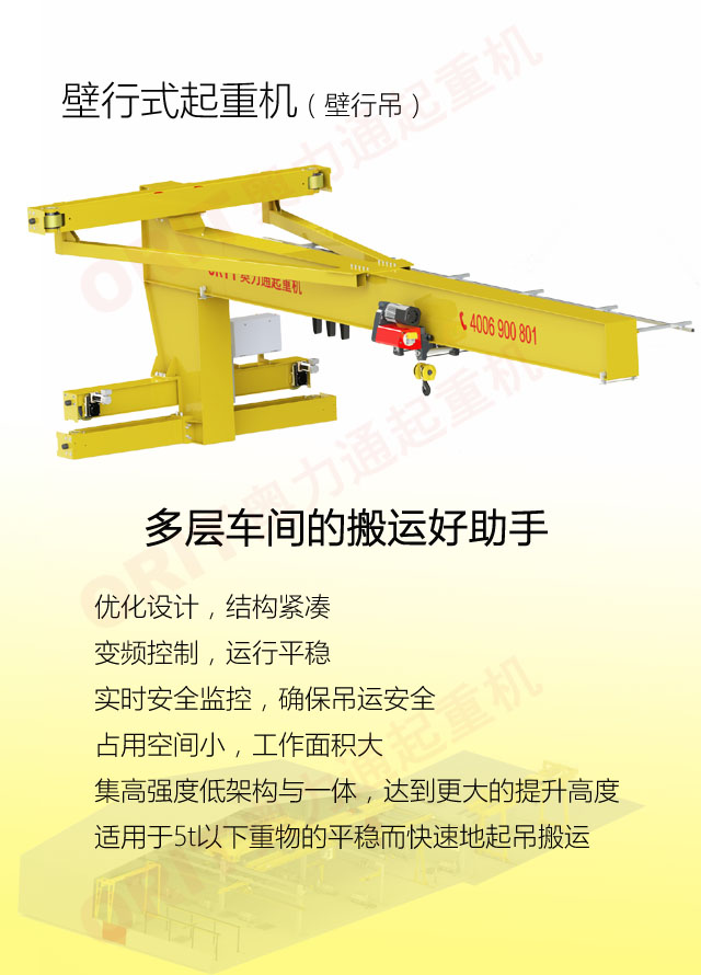 产品名称:壁行式起重机 多层车间的最佳选择 优化设计,结构紧凑 变频控制,运行平稳 实时安全监控,确保吊运安全 占用空间小,工作面积大 集高强度低架构与一体,达到最大的提升设计 适用于5t以下额定载荷平稳、快速地起吊搬运。 标准配置1:起升机构 颠覆传统,自成一体 低净空设计 柔性驱动,内应力小,传动效率高 重级制电机,接电持续率60%ED 行走变频无极调速,运行平稳 自调试电磁盘式制动器,可靠,防尘 2160N/mm² 高强度镀锌钢丝绳,免维护 全周型导绳器,防松绳 全系标配安全监控系统 标准配置2:三合一驱动 静音科技,静享搬运 结构紧凑,铝合金壳体,密封 变频电机+硬齿面减速箱+盘式制动器 龙门专用C型三合一集成化设计,节约空间 全变频调速 最高转速4800 r/min 防护等级IP55 半油脂润滑,免维护 静音科技,静享搬运 标准配置3:电控系统 安全随心掌控 智能安全监控器 计算起升机构剩余安全工作时间 累计起升工作时间 累计超载次数 累计起升电机启动次数 起升电机过热保护及报警 刹车片厚度报警 ... ... 远程通讯 施耐德电气元件 航空插座接口 IP55防护等级 标准配置4:端梁 多变灵活,适应自如 模块化直驱设计 自重轻、体积小 QT700车轮,自润滑,更静音 采用调心轴承,适应更自如 双轮缘端梁与平轮端梁完美结合, 既满足受力要求, 又彻底的解决了三条端梁(轨道)可能产生的啃轨问题。 应用