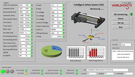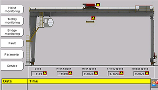 远程监控: 通过物联网远程管理、实时掌握智能起重机运行状态,实时显示各个机构运行参数、损耗、剩余寿命。无论身处何方,通过授权的远程诊断系统,均能实现远程故障诊断和预防性维保,确保智能起重机处于良好状态。